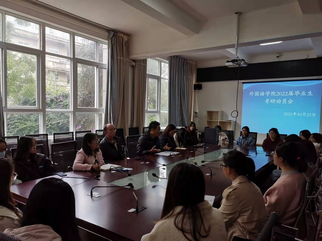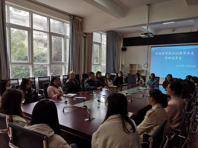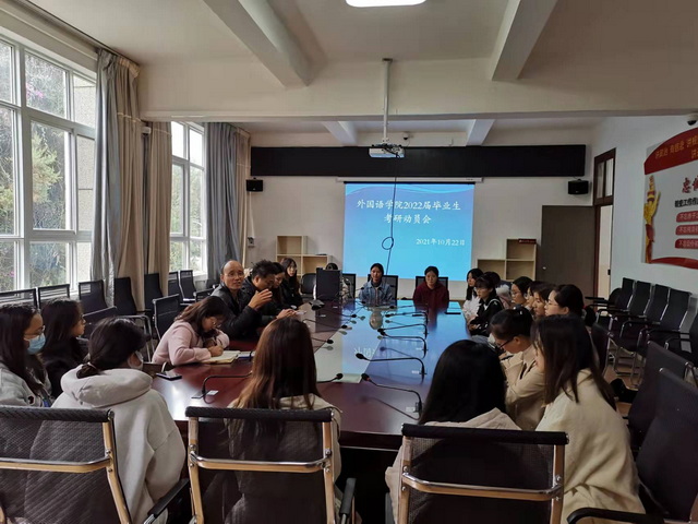 2021年10月22日星期五下午2点30分,外国语学院在2教316会议室召开2018级考研学生座谈会。会议由辅导员杨梅老师主持,郭跃东书记,周朝润院长,石常艳院长助理,18级年级主任方玉琼老师、冯默老师,教学秘书宫婷还有18级英泰缅有考研意向的学生参加了座谈会。