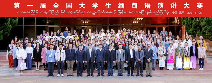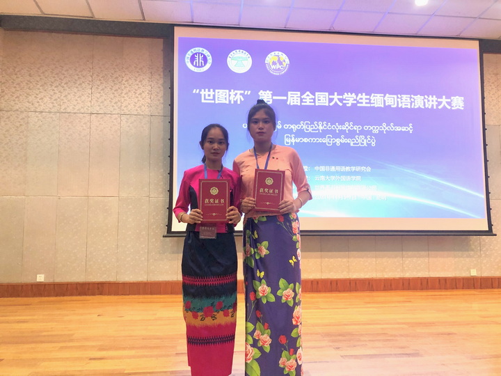 2021年11月6日,由中国非通用语教学研究会主办、云南大学承办、世界图书出版广东有限公司协办的“世图杯”第一届全国大学生缅甸语演讲大赛在云南大学东陆校区科学馆举行,由我校缅甸外教Myint Myint Aye老师指导的缅甸语专业学生蒋春美、张澜在激烈的校级比赛中脱颖而出,代表玉溪师范学院参加了此次比赛。