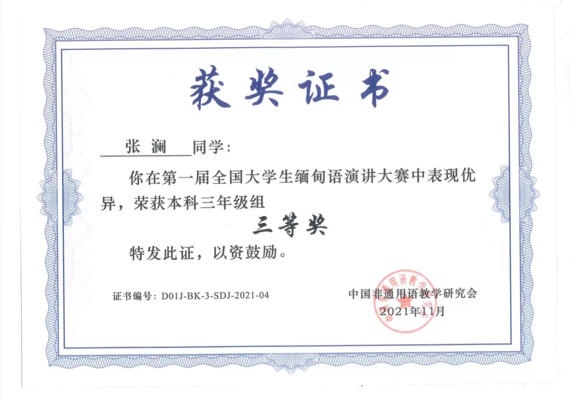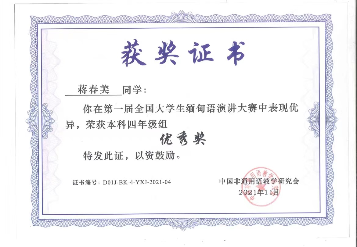 比赛当天选手身着各色缅甸传统服饰,用流利的缅甸语,深情地讲述着一个个令人感动的中缅故事。比赛进行得相当的激烈,来自全国各地的选手们用一口流利而地道的缅甸语自信而大方地进行演讲,堪称视觉与听觉的盛宴。选手们深情并茂的演讲时而慷慨激昂,时而舒缓动情。引起了观众强烈的震撼和共鸣,深深地打动了评委老师,赛场上掌声不断。我校的两位同学也在激烈的竞争中自信的展现了她们的风采。尤其是即兴演讲环节,大家都沉稳淡定,面带微笑,对话题进行深刻地阐述,展现了大家极强的思维能力和缅语专业水平。经过激烈的角逐,我校蒋春美同学获得第一届全国大学生缅甸语演讲大赛本科四年级组优秀奖。张澜同学获得第一届全国大学生缅甸语演讲大赛本科三年级组三等奖。