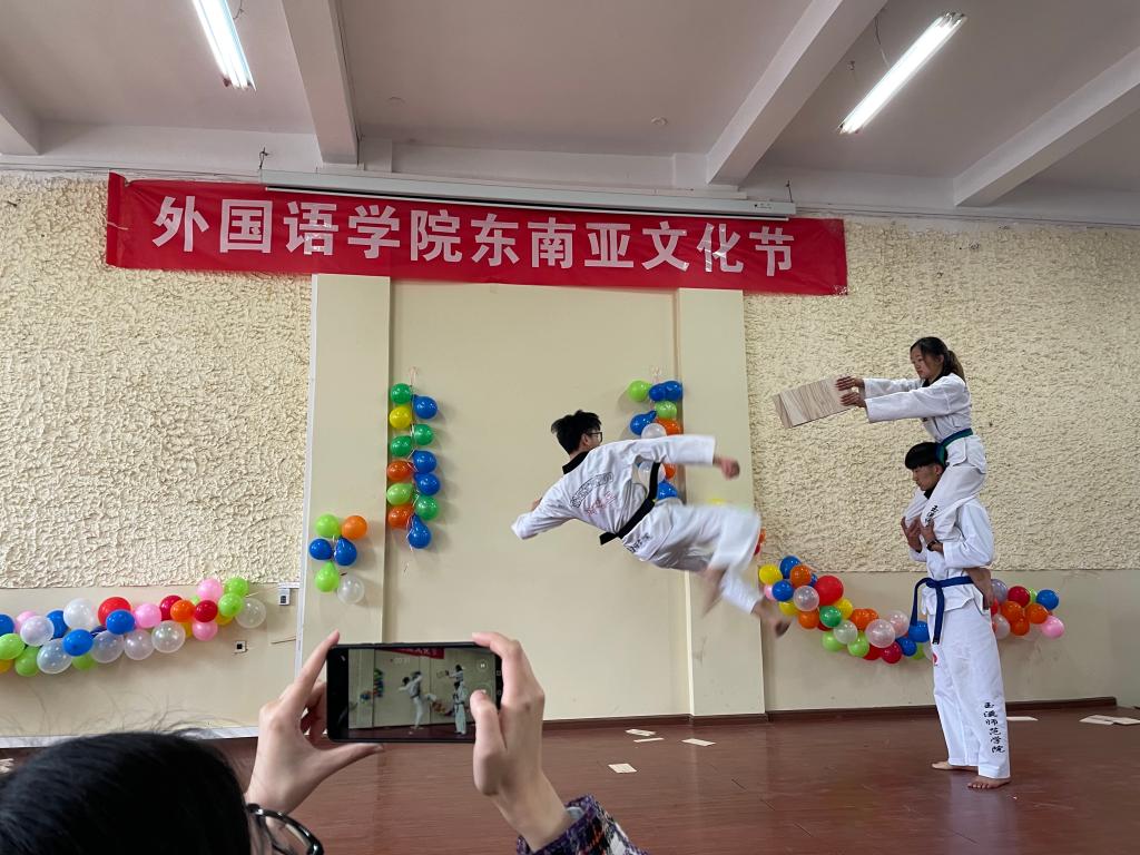 活动在跆拳道社团激情澎湃的表演中拉开序幕,他们整齐划一的双截棍棍法;他们优美潇洒的腿法,使师生们感受到跆拳道的武艺精髓。