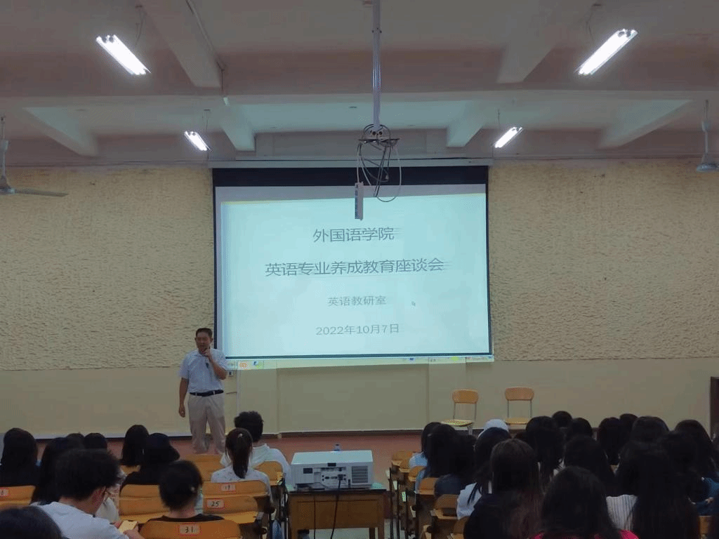 2022年10月7日19:00外国语学院英语专业核心课程教师李明、刘云、刘菊华老师于二教501教室为2021级、2022级英语专业的同学们开展了以“外语学习习惯培养,专业发展(听说读写技能)”为主题的座谈会。