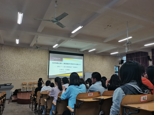 外国语学院牢记为党育人,为国育才使命,为帮助同学们树立正确语言学习理念,掌握语言学习的规律和方法,促进语言能力养成,2021429日晚,外国语学院在二教五楼阶梯教室开展了“育人育才”博士论坛第一讲。石常艳老师为主讲人,各年级同学均积极参加。