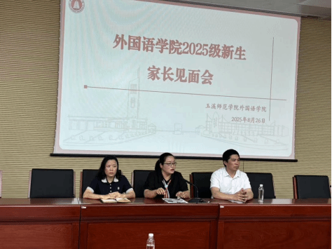 2025年8月26日下午三点,玉溪师范学院外国语学院2025级本科新生家长见面会在第二教学楼501报告厅顺利举行。本次会议由外国语学院党委副书记杨梅主持,外国语学院党委书记张敏、院长刘吉俊、副院长付丽彬、总辅导员李德文及百余名新生家长参加本次见面会。