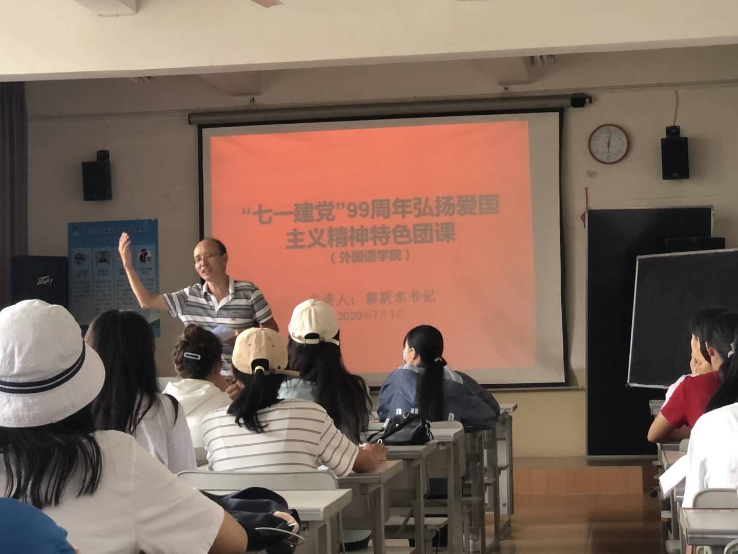弘扬爱国主义精神,庆祝中国共产党成立99周年,2020年7月1日,玉溪师范学院外国语学院于二教307教室开展“七一建党”99周年弘扬爱国主义精神特色团课,本次团课由党委书记郭跃东老师主讲,学生会全体成员、各班班长以及第三班委参加。
