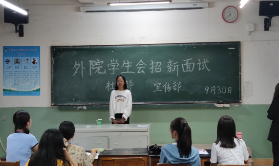 10月4日下午2点,外院团委学生会在二教501教室开展招新复试,通过初试的同学按次序轮流上台接受各部门负责人的提问。面试现场秩序良好,节奏紧凑。为了兼顾同学们的学习和工作,达到“学习工作两不误”的效果,在保证面试质量的前提下,精简冗杂的步骤,直奔主题。经过第二轮面试,最终人选确定,后续各部门部长通过手机短信的方式把面试通过的消息告知通过面试的同学,同时也对其他面试同学表示了鼓励。