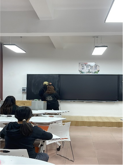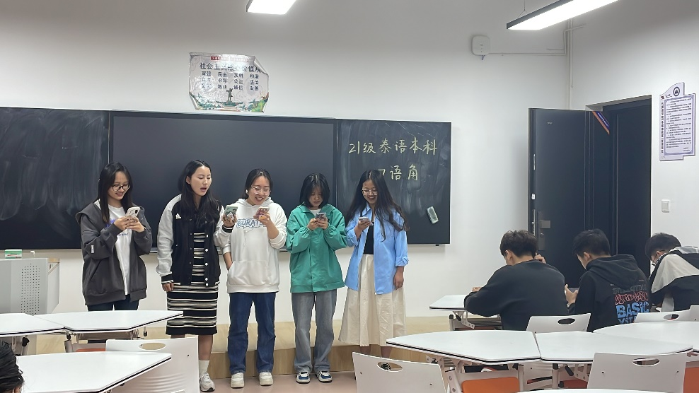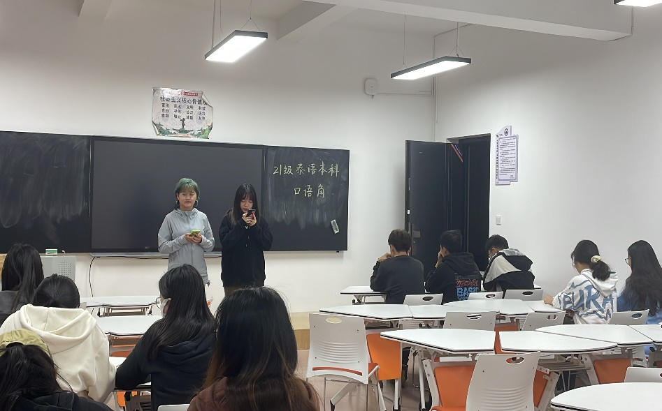 活动伊始,由王雨和杨谨旖同学用泰语介绍了本次活动的意义以及大致流程。随后,泰语角活动正式开始。第一个环节,以寝室为单位合唱泰语歌,最后评选出优秀寝室。接下来进入双簧表演环节,同学们配合默契,积极参与,用泰语讲述寓言故事,绘声绘色。最后进入“你画我猜”小游戏环节,队友需要猜出搭档在黑板上画出的物体并写出对应的泰语。