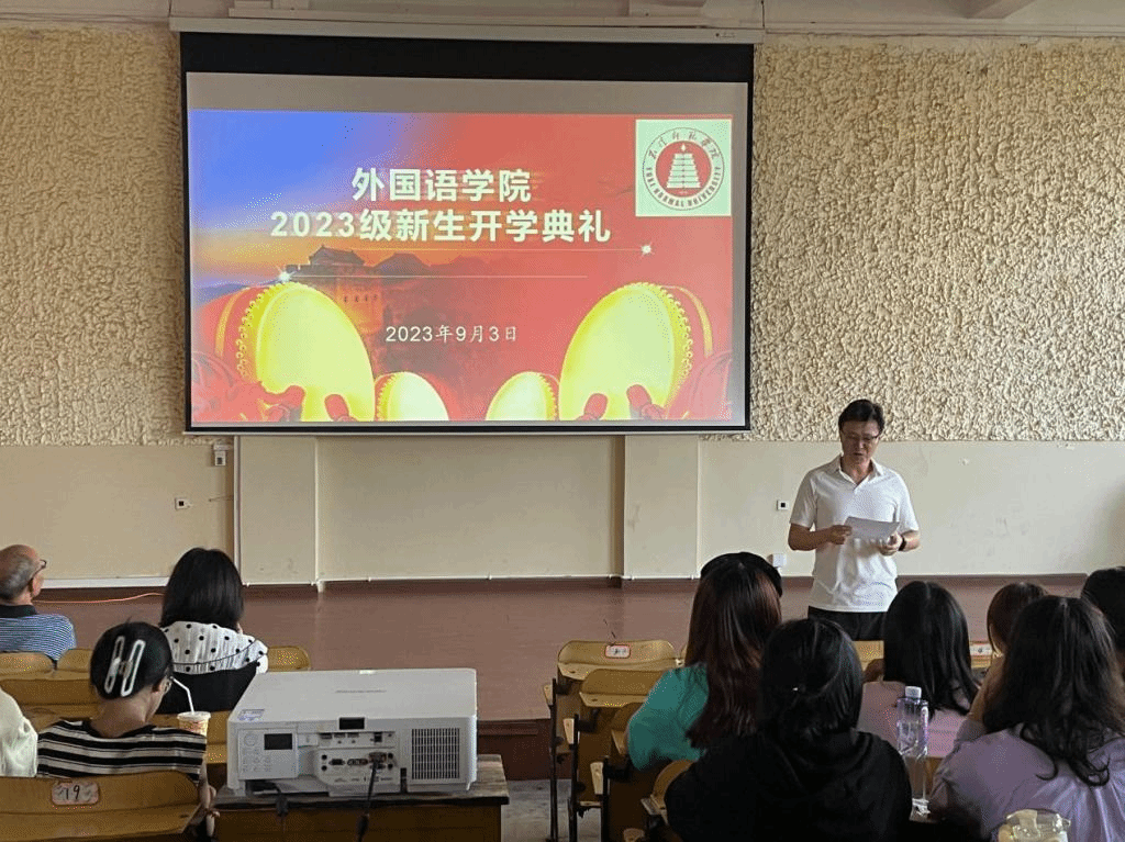 9月3日上午八点外国语学院于2教501举行了2023级新生开学典礼。褚小波老师向同学们详细介绍了到场的所有领导和老师并对新生加入外国语学院表示热烈欢迎。郭跃东书记给2023届新生开展了思想政治教育并强调青年人要有理想、敢担当、能吃苦、肯奋斗才能担大任。贾正林院长表达了对新生祝愿和期望,并针对专业前景发展与就业趋势做出分析,主要从培养目标、培养规格、等方面讲授其专业的相关内容,为新生的学习指明了方向。此外,贾院长还重点介绍了专业就业方向,帮助学生们了解未来自己可能从事的行业,并嘱咐学生们提前做好职业规划。最后,刘吉俊副院长为学生们分析了现今的就业形势和压力,并提倡学生们做好职业规划和学业规划,努力学习专业知识让自己竞争力提高。