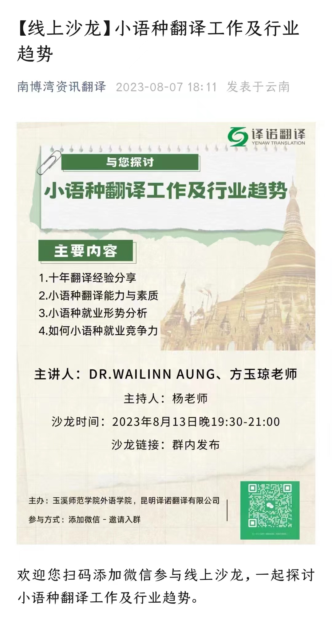 2023年8月13日19:30-21:30,玉师范学院外国语学院和昆明译诺翻译服务有限公司联合举办线上沙龙。本次活动是昆明译诺翻译服务有限公司与高校校企合作以及学生专业实习的首次线上直播活动,主要向实习的同学介绍非通用语翻译相关的从业经验。
