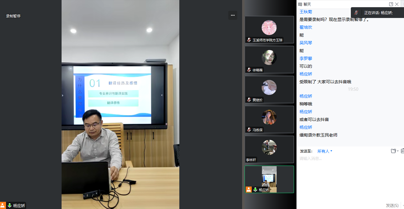 首先,方老师表示本次活动是我校2020级缅甸语专业同学实习的一部分,感谢合作单位昆明译诺翻译公司为实习同学准备了一次别开生面的交流学习活动。接着,方老师介绍了玉溪师院外国语学院缅甸语专业的办学情况。