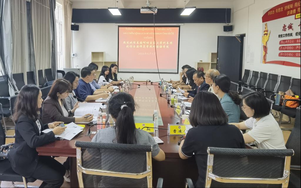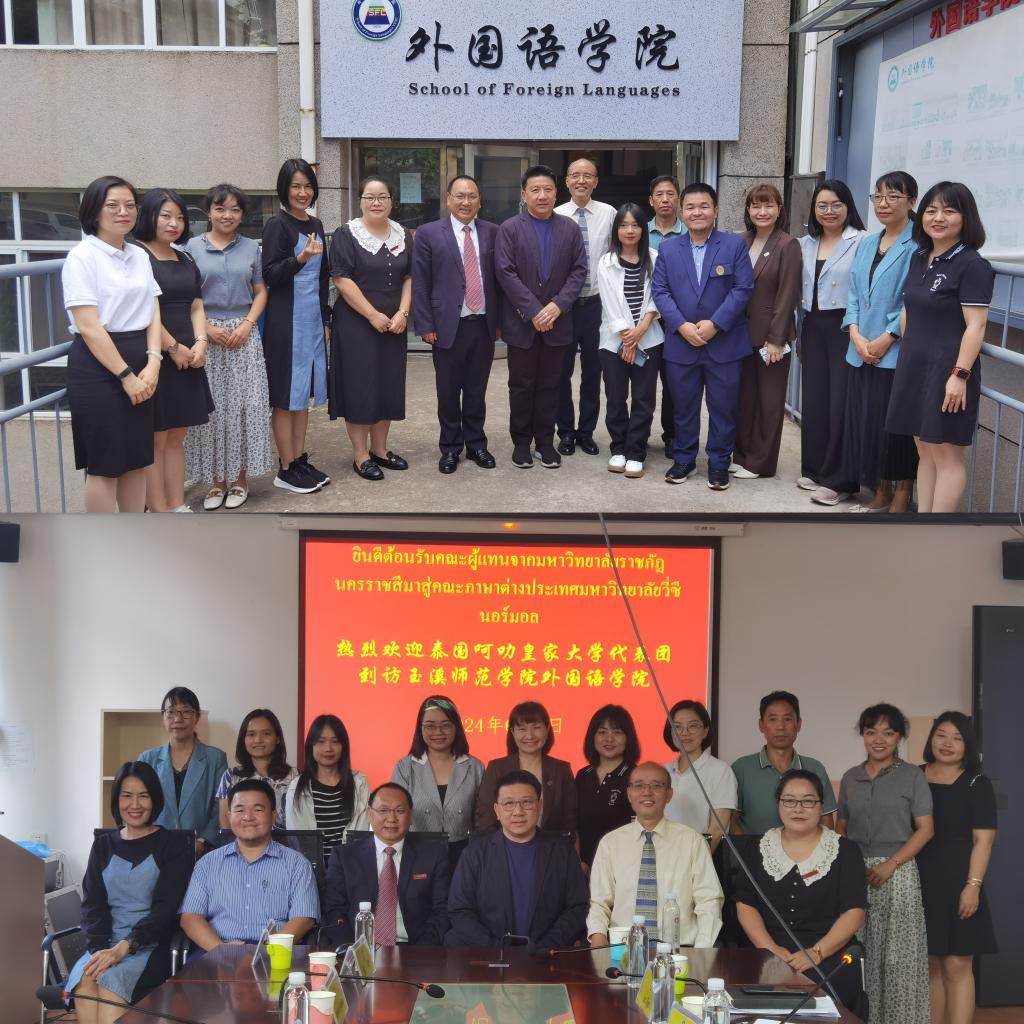 6月4日下午,泰国呵叻皇家大学校长阿迪索恩·纳瓦农达率领代表团一行11人到外国语学院展开座谈交流。外国语学院党委书记郭跃东、院长贾正林、副院长刘吉俊、教学事务办公室主任曹凌静、综合办公室主任徐羽、泰语专业负责人熊来湘、泰语班班主任赖艳、朱翔等在外国语学院二教316会议室热情接待来访外宾。会上,双方就泰语专业“2+2”办学模式的相关细节进行深入交流。