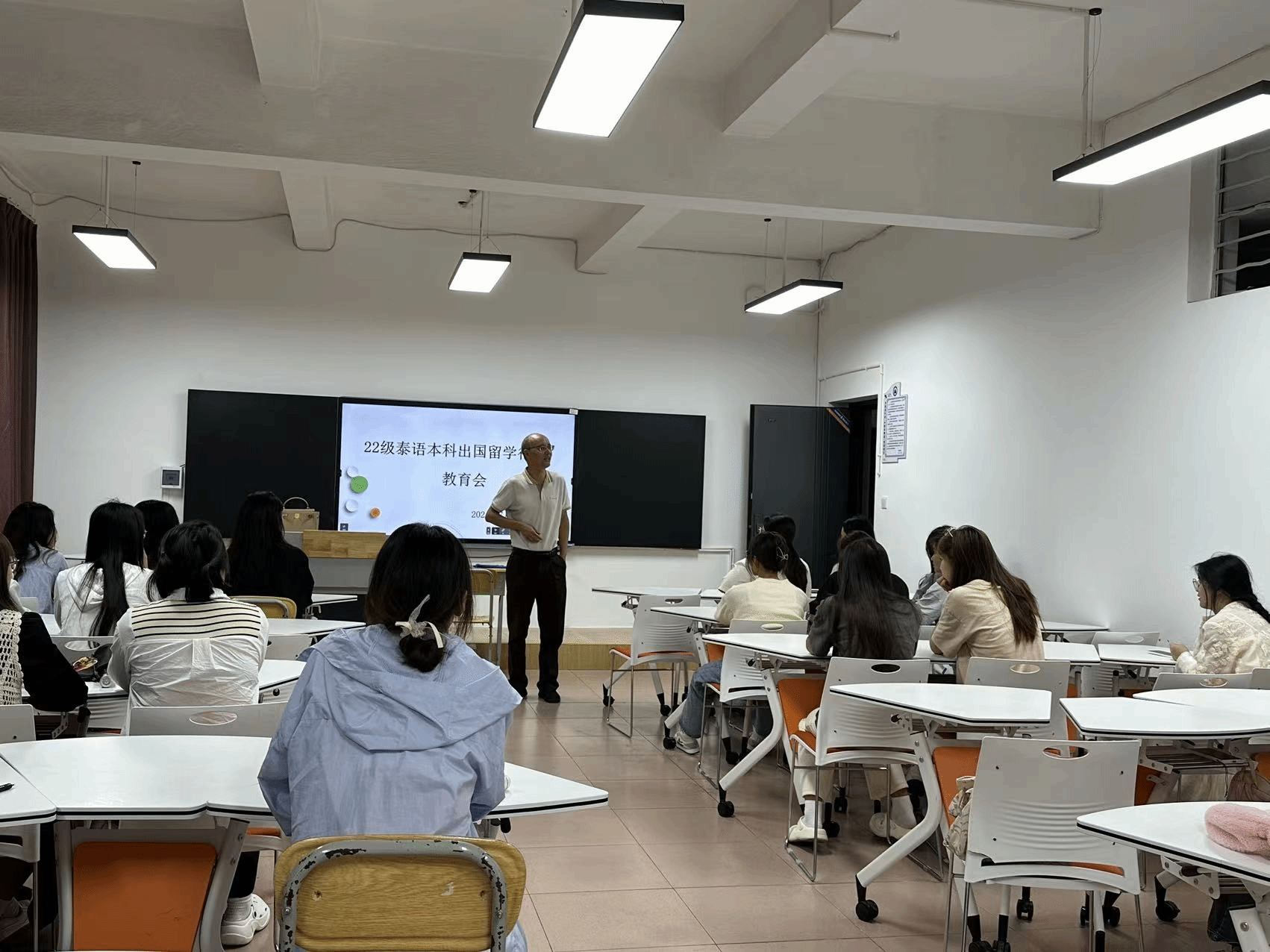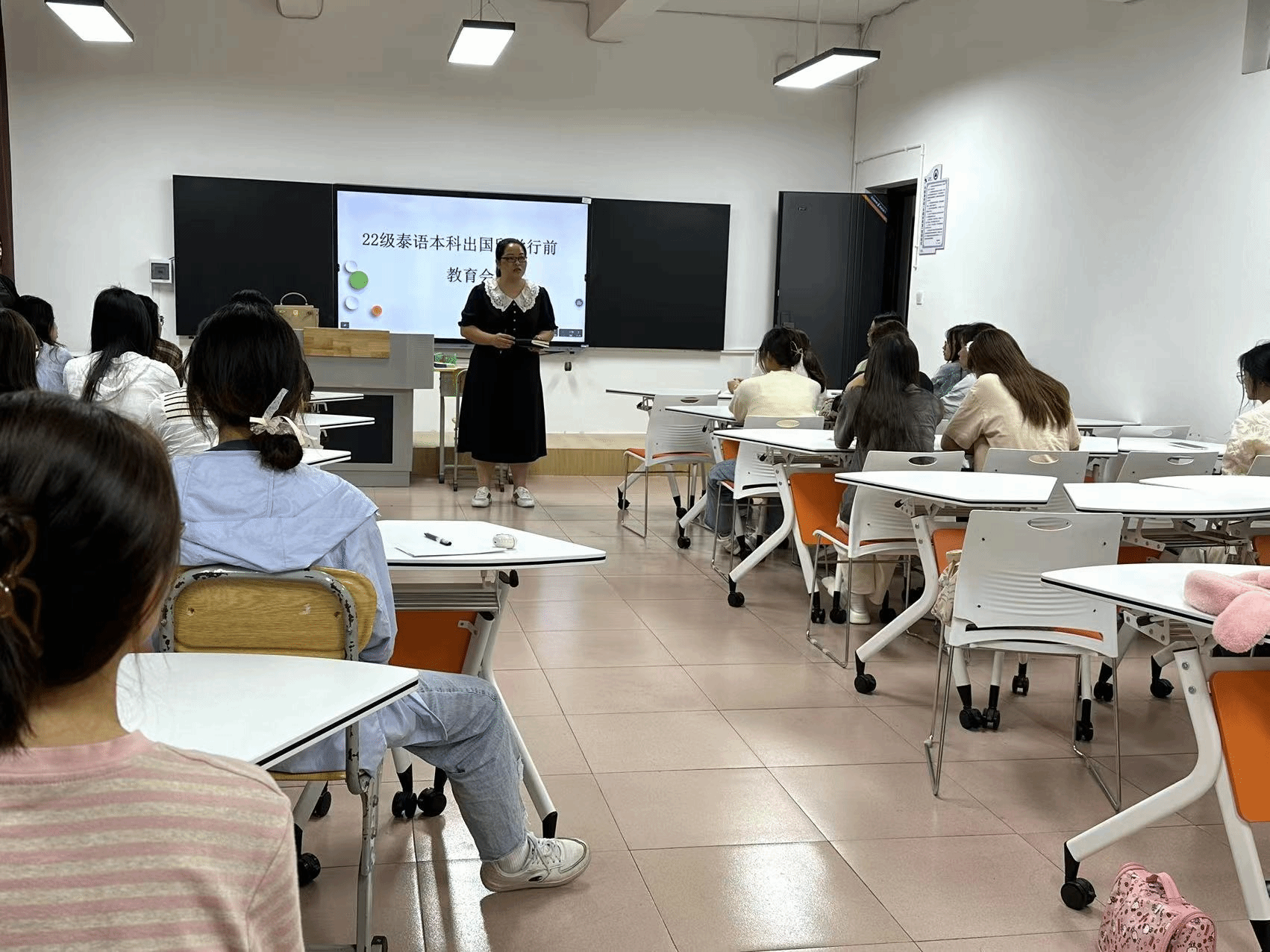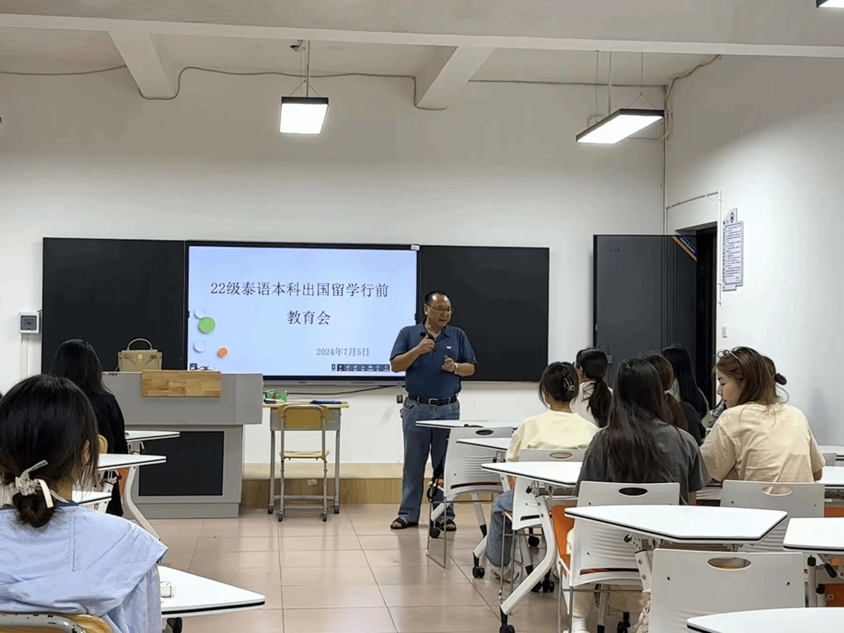 7月5日下午2:30,外国语学院在2教102教室为为即将赴泰学习的22级泰语本科班同学召开了出国留学行前教育会。外国语学院党委书记郭跃东、院长贾正林、教学副院长刘吉俊、22级泰语班主任赖艳参加了此次会议。