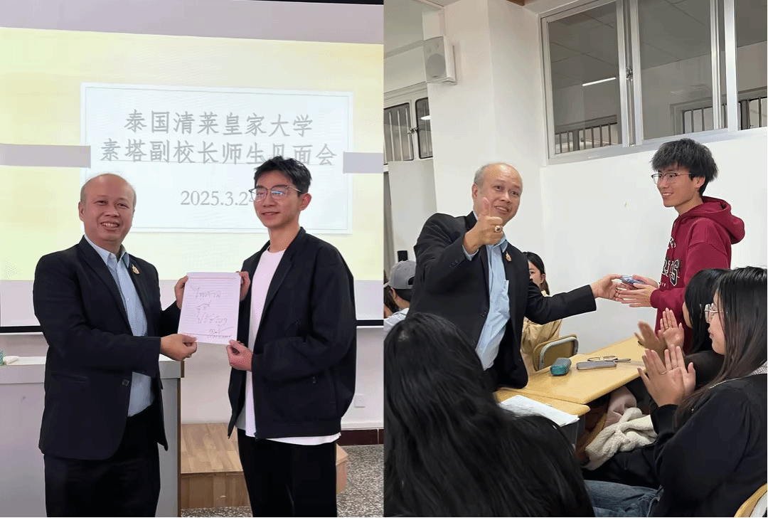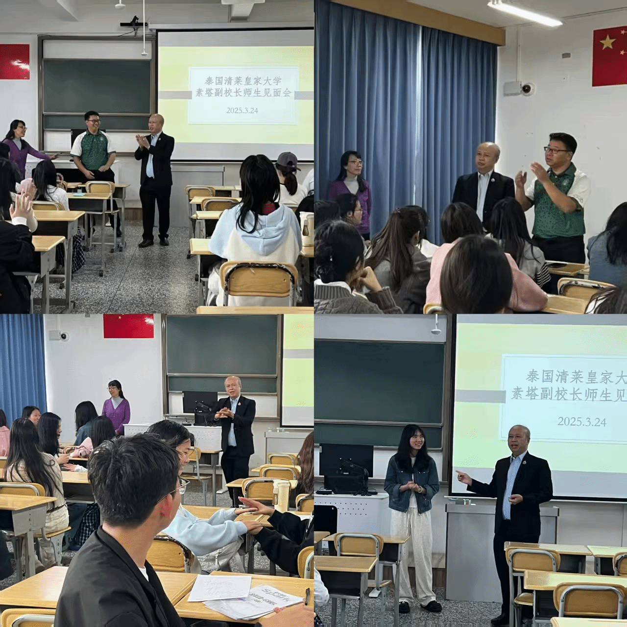 3月24日下午,泰国清莱皇家大学副校长苏塔·克莱苏皖深入2024级泰语本科班课堂与同学们进行互动交流,泰语专业教师熊来湘担任见面会翻译。苏塔副校长从泰语学习方法、泰国留学、就业创业等方面给予同学们细心指导,并耐心回答了大家提出的问题。