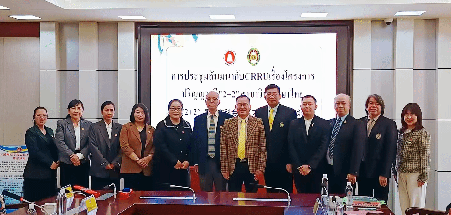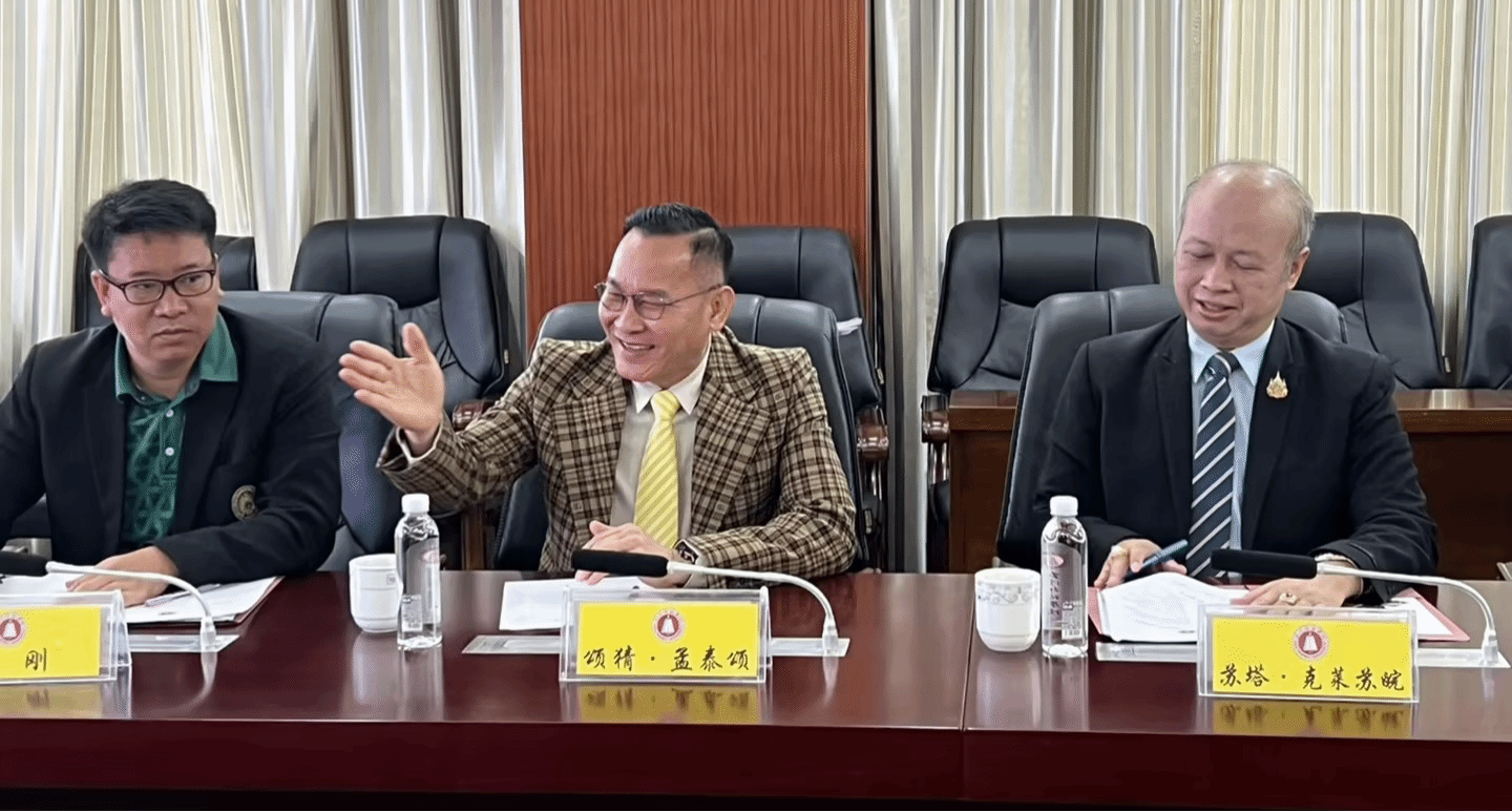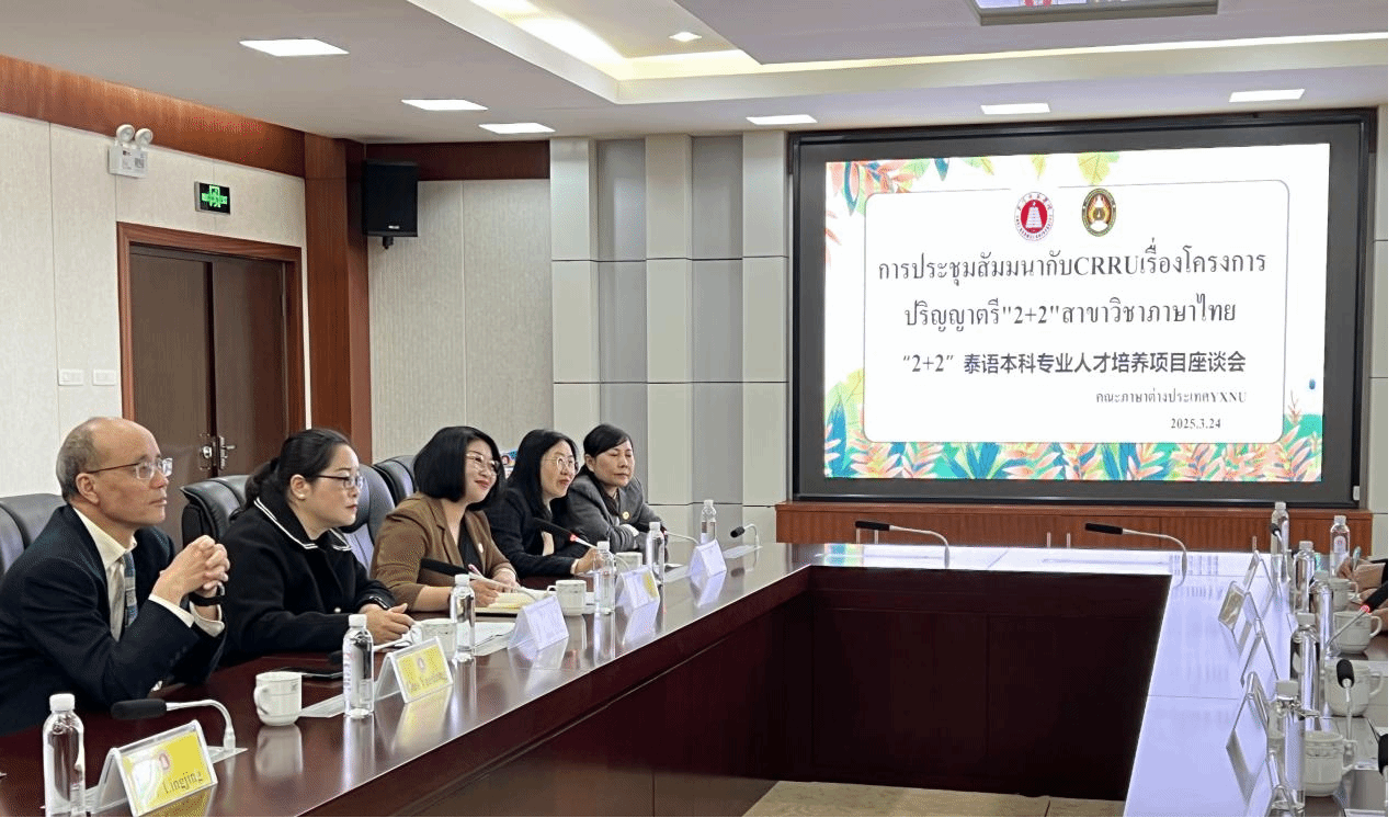 3月24日上午,泰国清莱皇家大学校长颂猜·孟泰颂率领代表团一行到外国语学院展开座谈交流。外国语学院党委书记郭跃东、院长刘吉俊、对外合作交流处处长杨春、副处长吴晓颖、外国语学院教学事务办公室主任曹凌静、泰语专业负责人赖艳、团委书记马继彬、泰语班班主任田昌丽参加座谈。双方在图书馆6005会议室就“2+2”泰语本科专业人才培养模式展开深入交流。