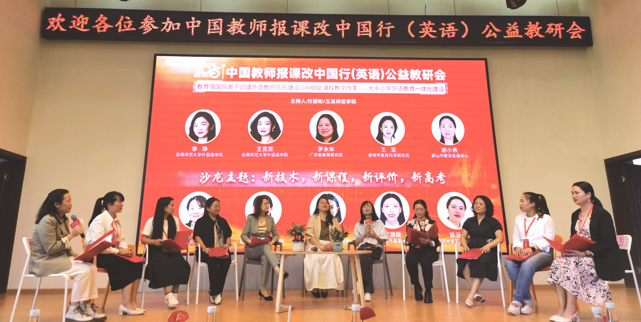 学院英语专业负责人付丽彬担任课改沙龙“新技术,新课程,新评价,新高考”环节主持人,与来自广东、江苏、云南等地的名师专家就初高衔接、教考衔接和英语教师数字素养等话题展开深度对话。