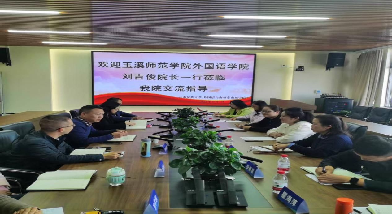 为进一步拓展办学视野,深化教育教学改革,提升学科建设与人才培养质量,2025年11月7日,外国语学院院长刘吉俊、副院长付丽彬率领学院各专业负责人一行6人,赴云南民族大学外国语与南亚东南亚学院进行专题研讨与深度交流学习。