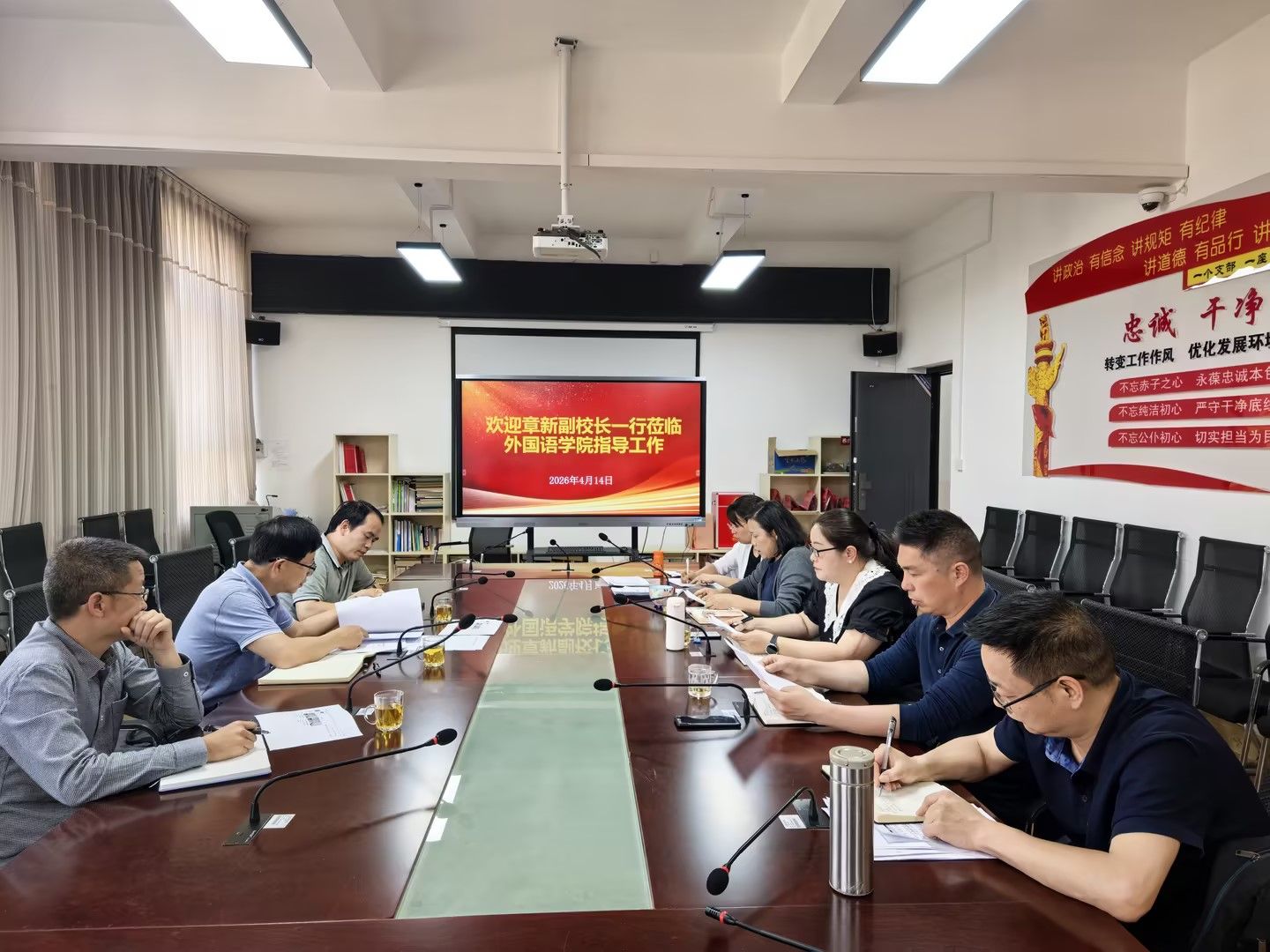 为深入贯彻落实新时代教育数字化战略,切实提升学生全球胜任力,2026年4月14日下午,章新副校长带领教务处副处长李学儒、师洪到外国语学院开展大学英语教学改革专题调研,重点围绕教学改革实施、基层教学组织运行、课程体系优化及智慧课程建设等核心工作进行指导。外国语学院党委书记张敏、院长刘吉俊、副院长付丽彬、大学英语教研室主任瞿海萍及副主任禹宏亮参与调研座谈会。