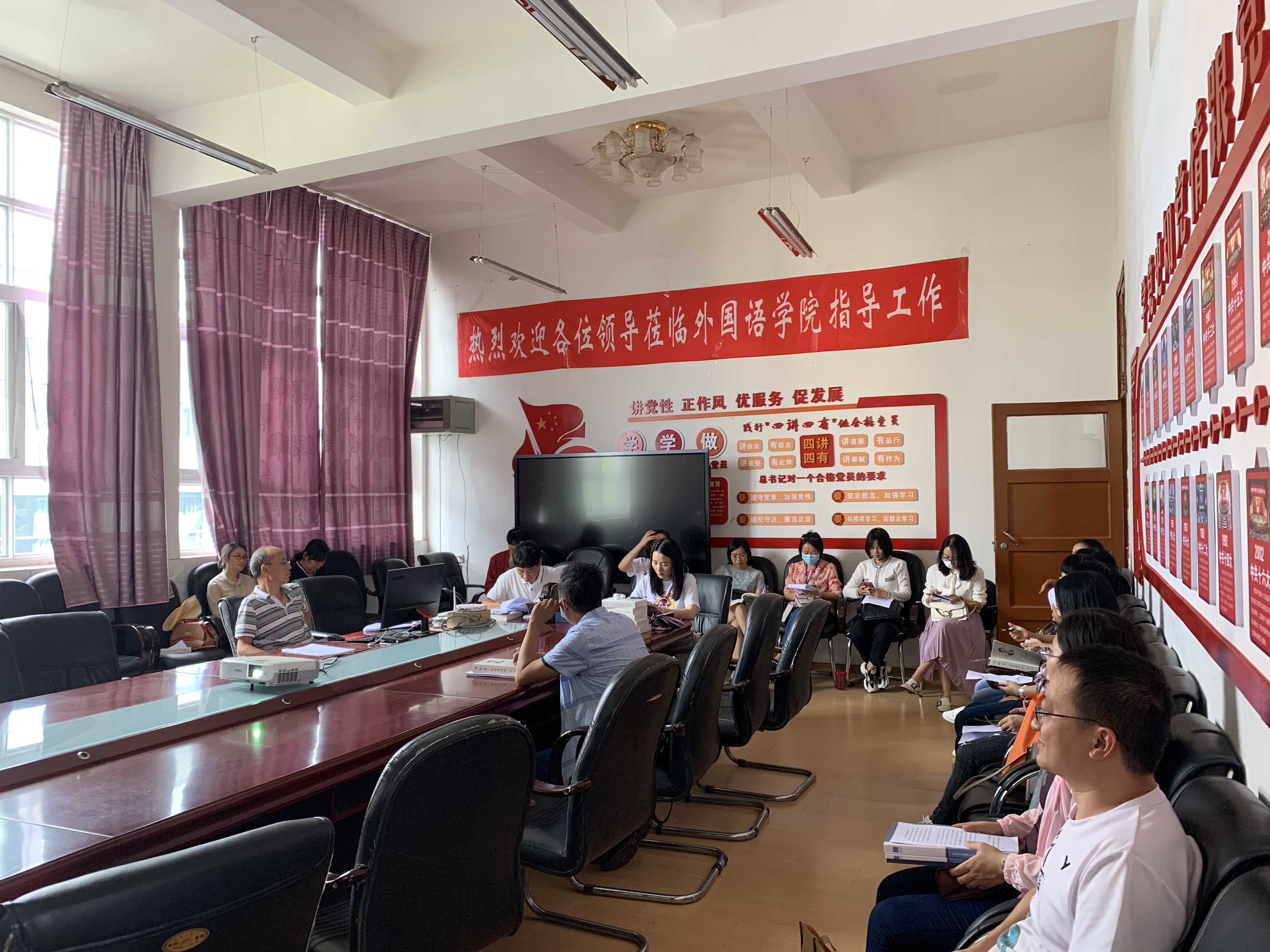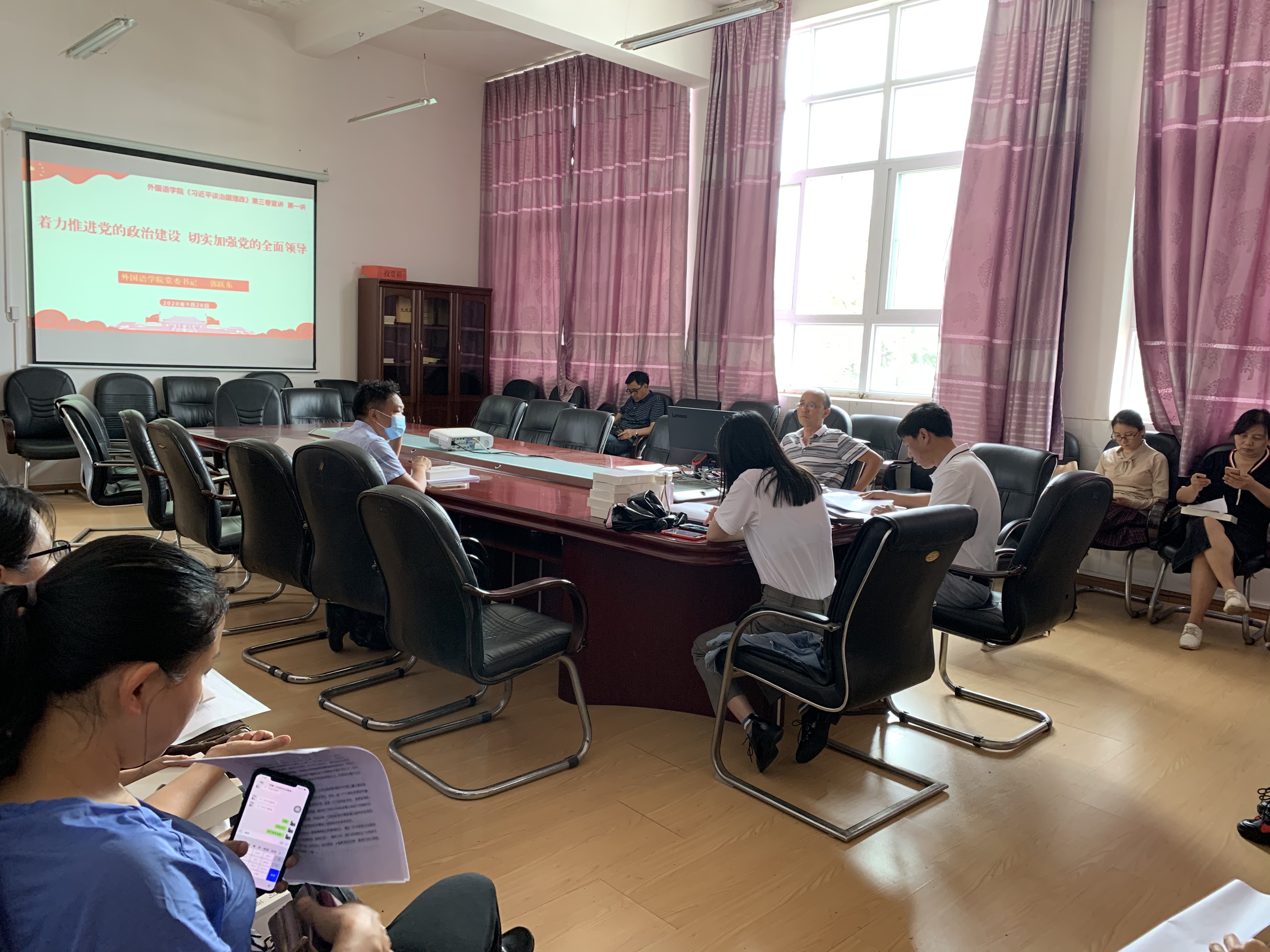2020年9月28日14点分,外国语学院教工党支部邀请党委书记郭跃东同志支部全体教师党员讲授“《习近平谈治国理政》第三卷”党课。