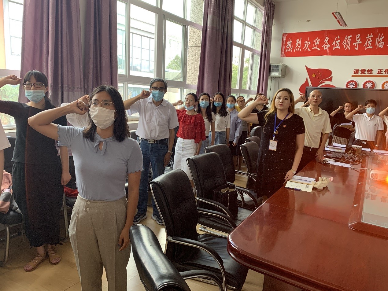 外国语学院党委书记郭跃东同志向全体教工党员教授主题为“学习习近平新时代中国特色社会主义思想——守初心,担使命”党课;为李明、蔡丽红、何亚琼、郭莹四名党员庆祝政治生日;重温入党誓词。