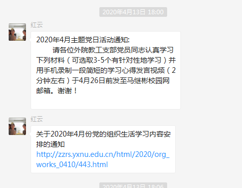 4月26日,各位党员同志提交了学习心得视频。通过这次学习,外院教工支部的同志们认为,中国人民之所以能在短短的3个多月时间内就基本控制了来势汹汹的疫情是因为有中国共产党的正确领导和习近平总书记的亲自部署科学施策。