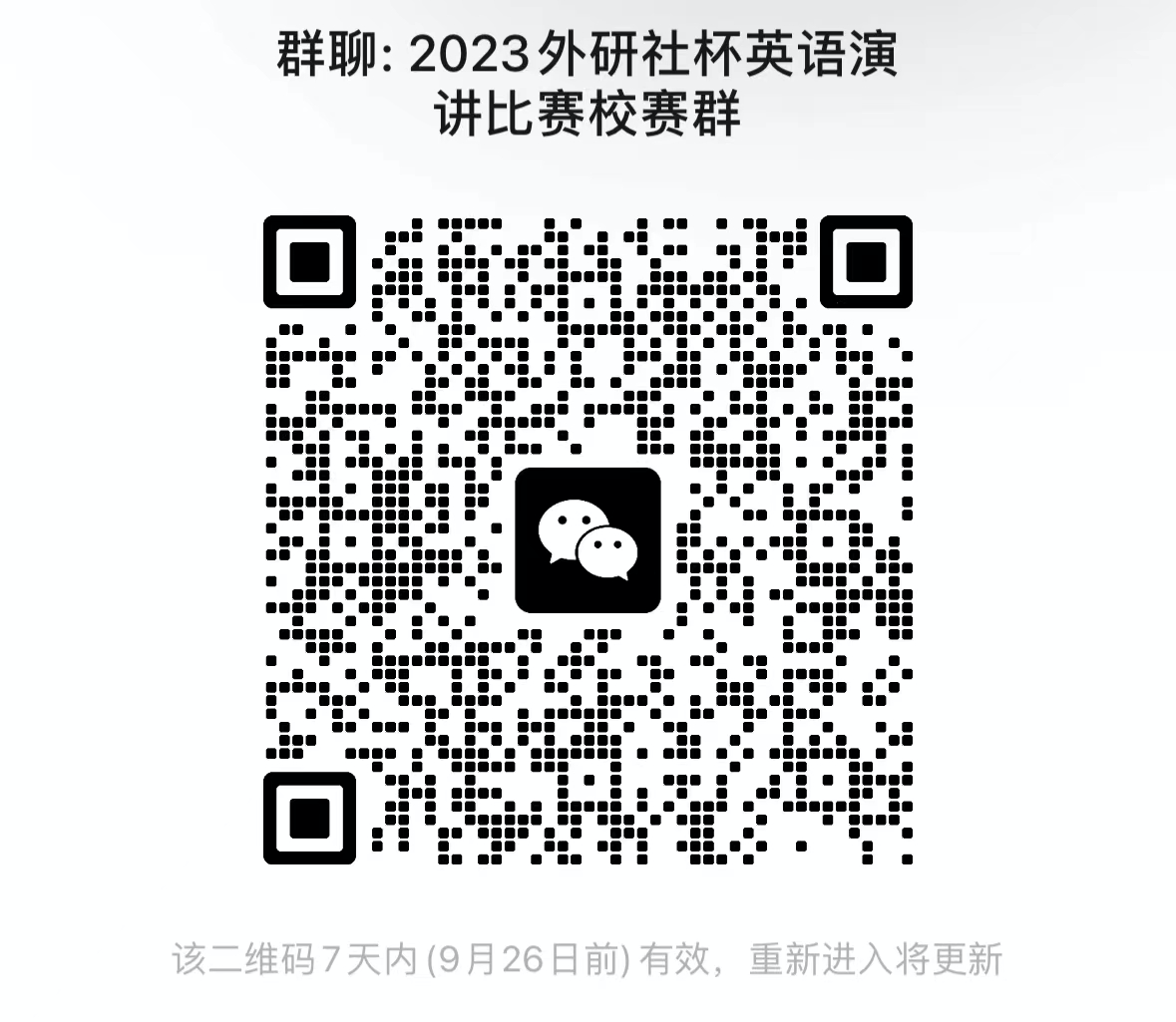 请提交报名信息的同学,在9月25日前扫描二维码进入 2023外研社杯英语演讲比赛校赛群。
