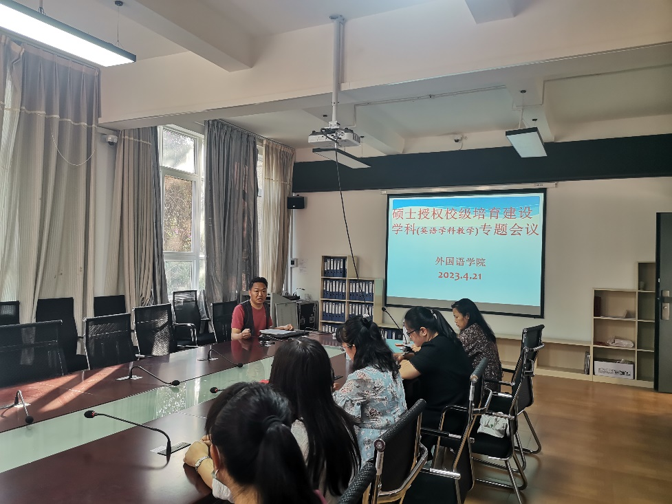 英语专业硕士授权校级培育建设学科(英语学科教学)专题会议于2023年4月21日早八点半在2教316会议室召开。此次会议由周朝润院长主持,参会人员为英语专业骨干教师团队成员。