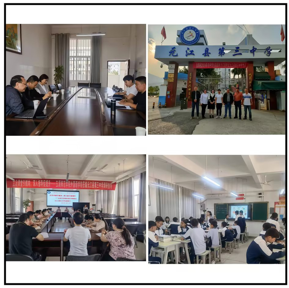 3月21日,外国语学院院长贾正林率办公室主任徐羽、英语系副主任刘菊华、英语专业教师代表张善富一行4人,赴元江县第三中学开展调研交流活动。元江县第三中学校长杨亚萍,副校长白金平,教科室主任李丹以及英语学科教研室的相关教师参加交流活动。