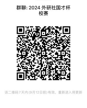 请提交报名信息的同学,在9月9日前扫描二维码进入 2024外研社杯外语能力大赛 日语(非专业组)选拔赛校赛群。
