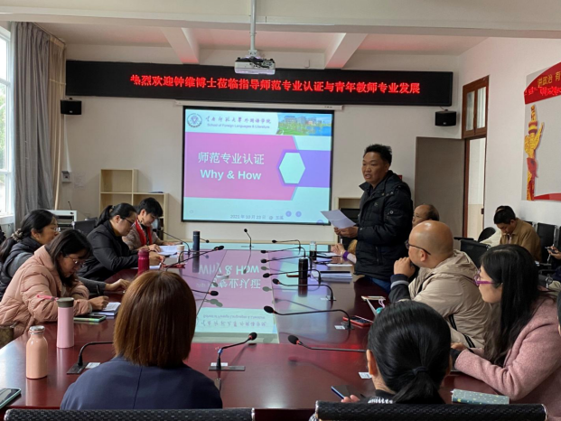 为了更好地推进和落实外国语学院目前正在开展的师范认证准备工作,也为了更好解除青年教师在专业发展方面遇到的疑惑,外国语学院学院特邀云南师范大学外国语学院副院长钟维博士莅临交流师范认证经验并就青年教师专业发展答疑解惑。该活动为外国语学院2021年第一场“请进来”活动,即邀请校外专家前来讲学。活动于2021年10月23日举行,由外国语学院周朝润院长主持,该院全体教师参加了活动。钟维博士为外国语学院开了两场讲座。讲座主题分别为“英语专业师范认证准备工作注意事项”、“西部高师院校青年外语教师专业发展:困境与机遇”。