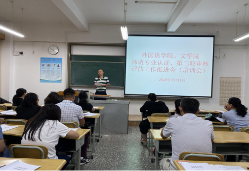 2021年7月18日晚7点,外国语学院和文学院全体教师在14教305参加了师范专业认证、第二轮审核评估工作推进会。外国语学院周朝润院长代表两院老师感谢和欢迎教务处普春旺副处长来参加该工作会并就《教师课程手册》填写做专题培训。
