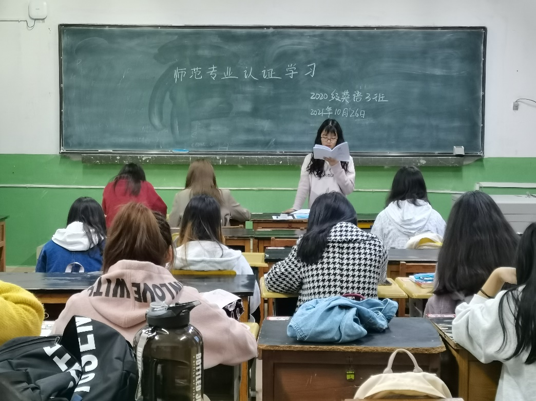 作为英语专业师范类本科生,为使同学们加强师范类相关知识的了解,2020级英语3班于2021年10月26日在二教开展了师范认证学习班会。