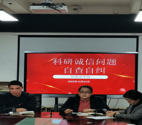 根据学校工作安排,外国语学院于2025年10月22日下午2:30,在第二教学楼316会议室开展科研诚信问题自查自纠活动,刘吉俊院长主持,全体教师参加。