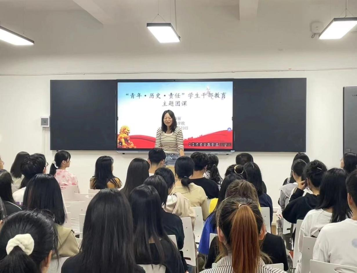 青春使命,责任担当。在外国语学院团委学生会补充新鲜血液的重要时刻,为锤炼团员干部的工作能力和提高思想觉悟,发挥好榜样精神和先锋模范作用,让新同学们能够更好地适应大学生活,增强班级的凝聚力,外国语学院团委书记谢春丽老师于2022年9月23日19:30在二教109教室开展了以“青年·历史·责任”为主题的学生干部教育主题团课。外国语学院各学生干部均按时参加本次团课。