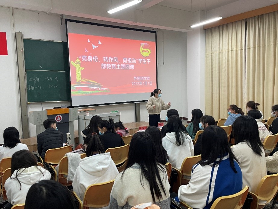 为加强学生干部思想政治教育和意识形态建设,外国语学院于2022年4月1日18:30在14教105开展“亮身份、转作风、勇担当”学生干部教育主题团课。本次团课由外国语学院团委书记谢春丽老师主持开展,全体学生干部均到场。
