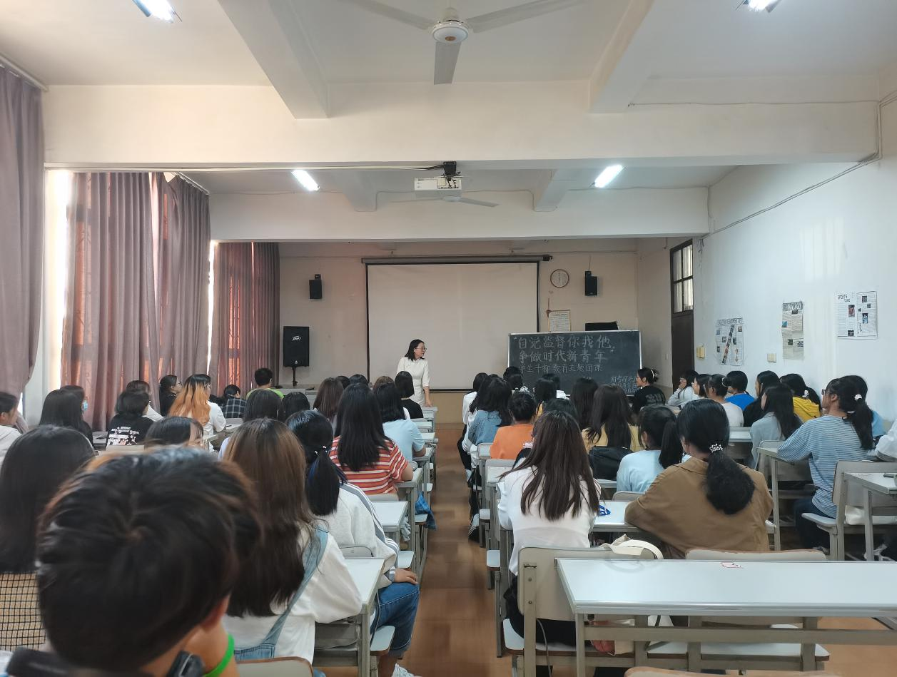 2021年9月28日下午6:00,外国语学院团委书记谢春丽老师于二教307室为青年学生干部上了一堂生动的教育主题团课,团课主题为“自觉监督你我他,争做时代新青年”