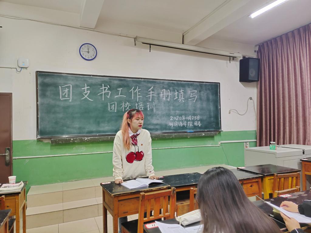 2020年11月25日晚九点,外国语学院团委在二教404教室开展了主题为“团支部工作手册填写”的团校培训,本次团校培训2018、2019、2020级各团支部团支书全部准时参加,外国语学院团委副书记杨柳主讲,就如何规范填写新版团支部工作手册展开此次培训。
