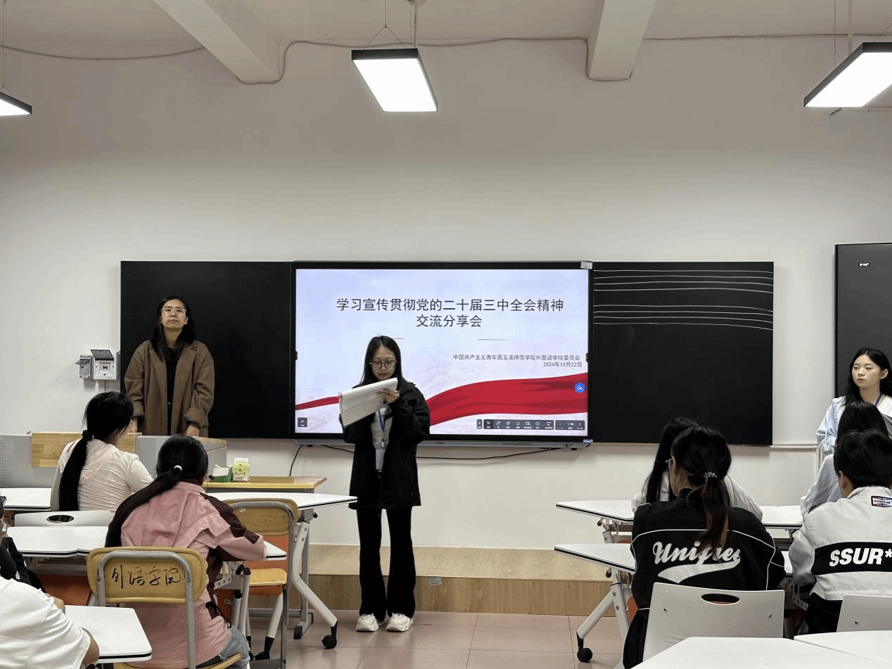 为积极响应党中央的号召,深入学习贯彻党的二十届三中全会精神,玉溪师范学院外国语学院共青团于10月22日召开了一场“学习宣传贯彻党的二十届三中全会精神交流分享会”。外国语学院团委书记马继彬老师,团委学生会各成员及各班班委参加了此次会议。