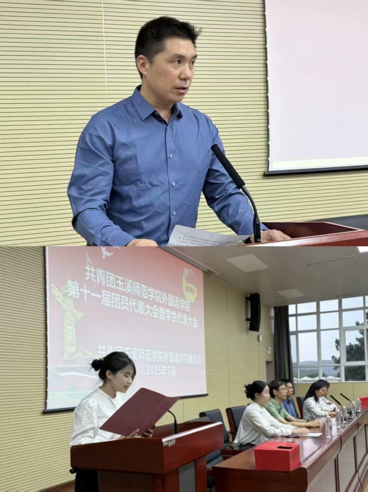 2025年5月23日,玉溪师范学院外国语学院第十一届团员代表大会暨学生代表大会在2教501隆重举行。外国语学院党委书记张敏、团委书记马继彬、第十届学生会主席团成员及130名团员代表、学生代表参会。本次大会共有五项议程,各议程严格有序进行。